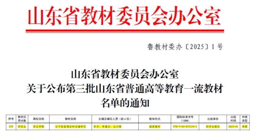 我们牟丹教授以第一主编撰写的研究生教材《分子组装理论和光谱研究》成功入选第三批山东省普通高等教育一流教材。