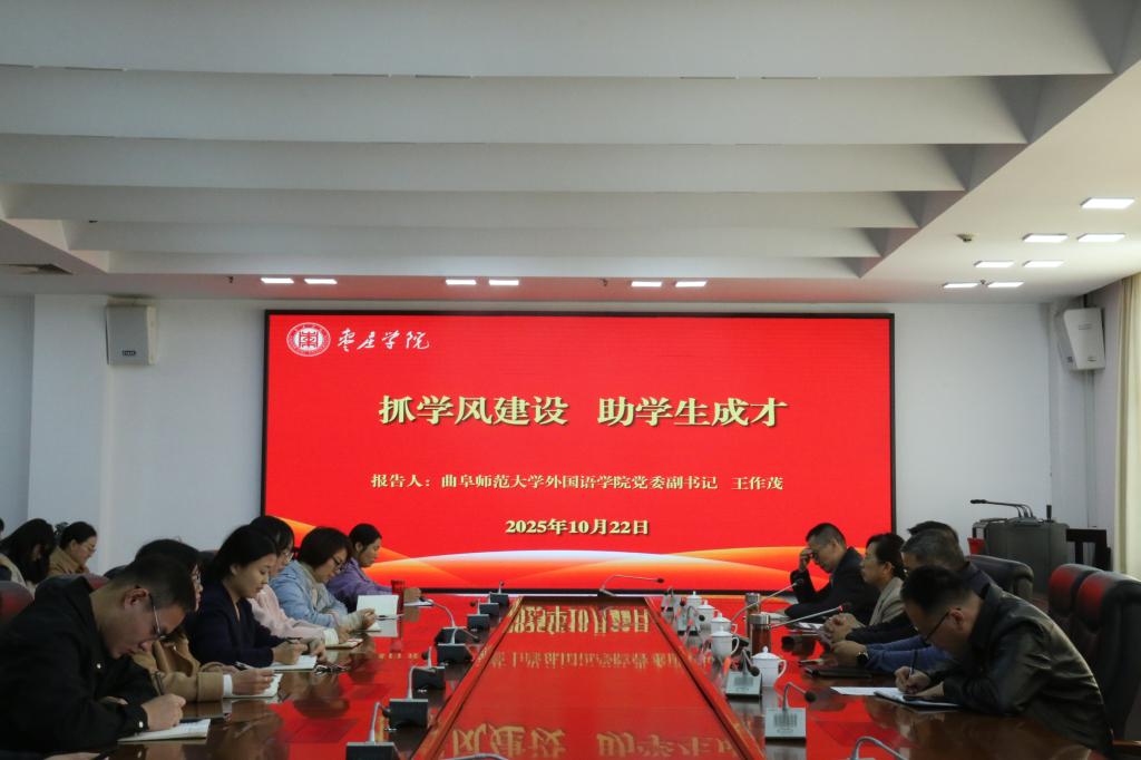 为厚植勤学善思的学风土壤,营造崇德向学的育人氛围,10月22日上午,我们特邀曲阜师范大学外国语学院党委副书记王作茂,开展以“抓学风建设,助学生成才”为主题的专题讲座。学院党政领导班子、班主任及辅导员参加本次讲座。