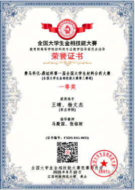 在综合分析总决赛中,我们材料科学与工程专业陈涵杨和焦文兵同学获个人三等奖,在创新应用赛道,凭借扎实的专业基础和出色的应用能力,王晴、杨文杰同学获得一等奖,陈心悦、孙婧琦获二等奖,冀永娇、王鑫阳获三等奖。