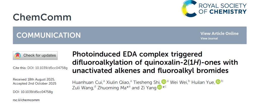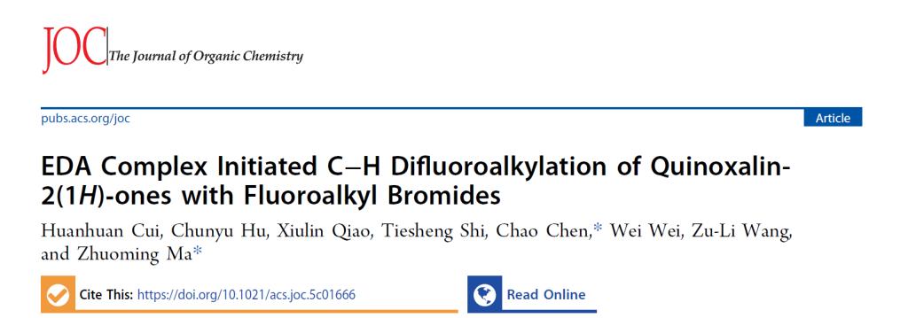 研究成果二:《Photoinduced EDA complex triggered difluoroalkylation of quinoxalin-2(1H)-ones with unactivated alkenes and fluoroalkyl bromides》。本研究开发了一种新颖、实用的光化学方法,用于合成C3-二氟烷基化的喹喔啉酮类化合物。其最大的亮点在于巧妙利用底物自身形成EDA复合物,完全规避了金属催化剂和外源光催化剂的使用,体现了绿色化学和步骤经济性的核心理念。这项工作不仅为含氟喹喔啉酮库的快速构建提供了强大工具,也为其在药物发现和功能材料中的应用开辟了新的可能性。更重要的是,这种基于EDA复合物的催化模式为其他类型惰性化学键的活化与官能团化提供了新的思路和借鉴。崔环环博士为本论文第一作者,必赢bwin线路检测中心为第一完成单位。该研究得到山东省自然科学基金和必赢bwin线路检测中心博士基金等项目支持。